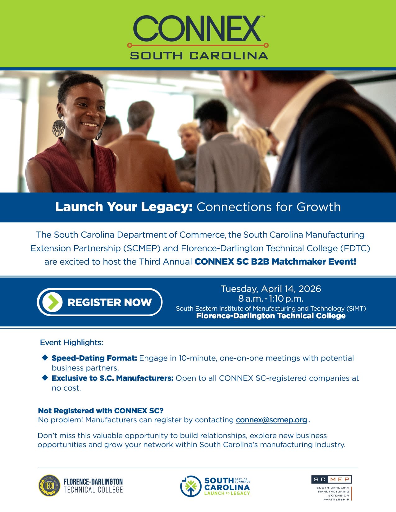 Join us for the CONNEX SC B2B Matchmaker Event, and meet your next business partner. Open to all CONNEX SC registered companies. If you are not registered, you can today!