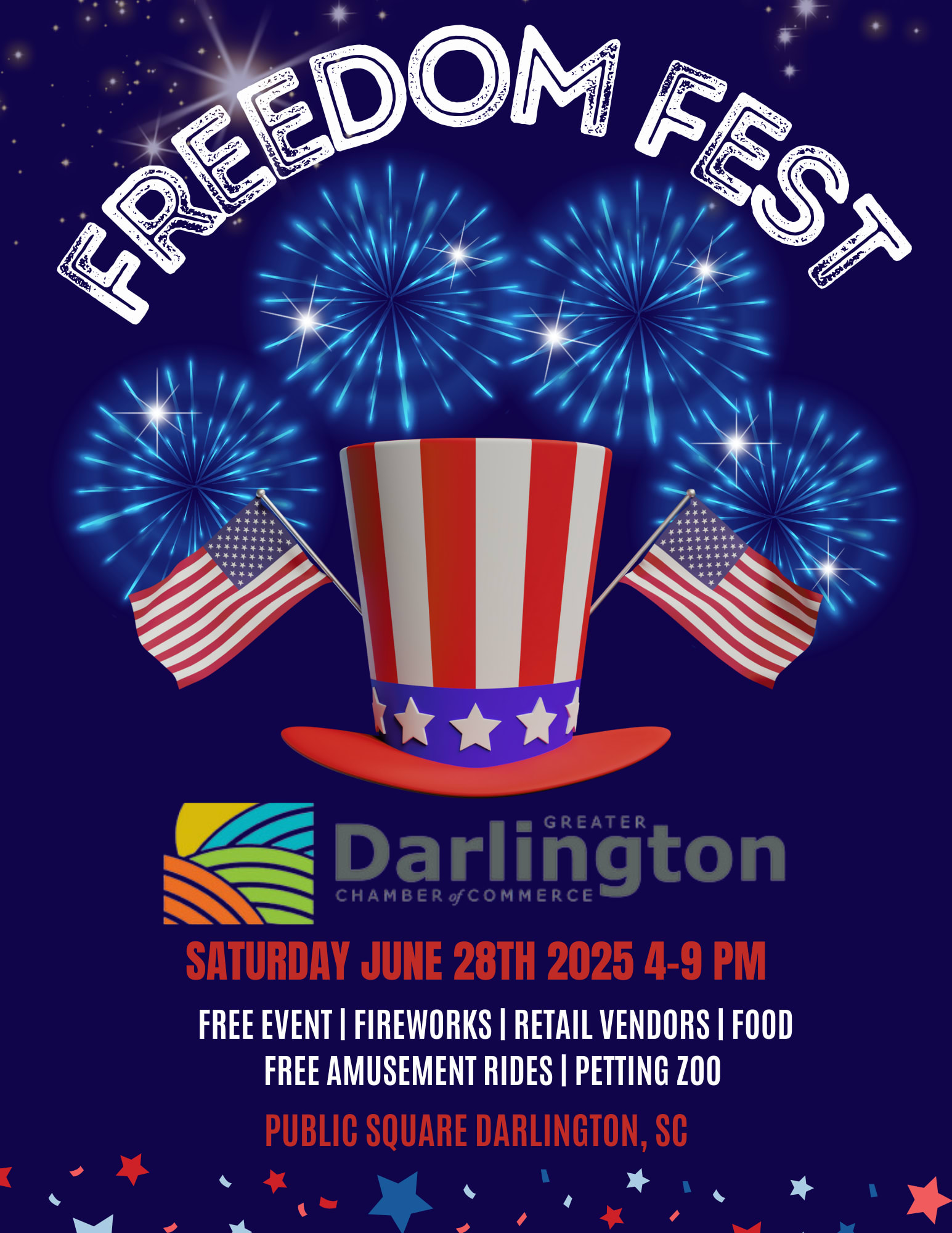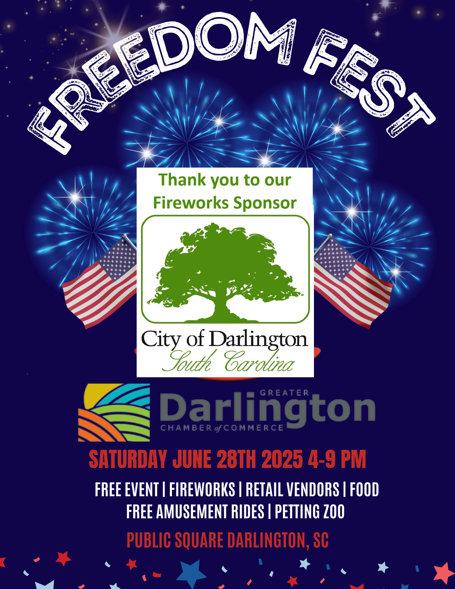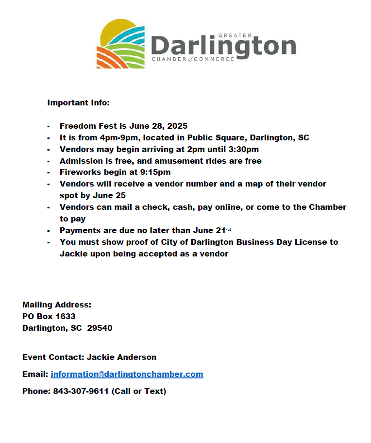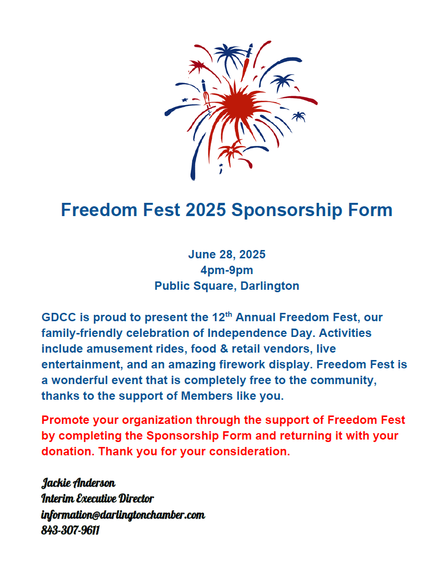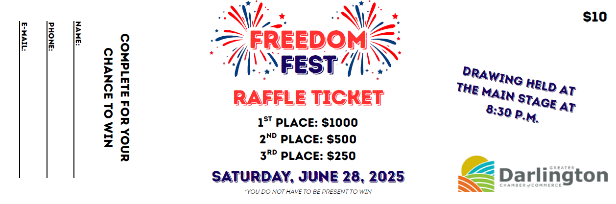 The Greater Darlington Chamber of Commerce is hosting our 12th Annual Freedom Fest event! A large firework show, retail & food vendors, free amusement rides and more!