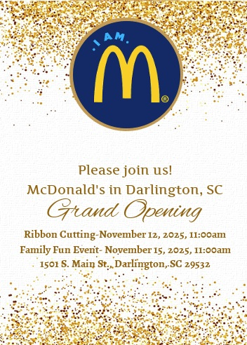 Join us for the Grand Reopening of Darlington McDonald's! Ribbon Cutting at 11AM followed by a Family Fun Event.